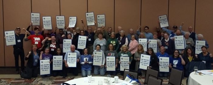 Our Vision:  We are a courageous union whose members collectively forge a future in which working people build just and democratic workplaces and communities.