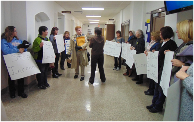 Over the next few weeks, members talked to their coworkers during the day and made calls at night to recruit staff to attend the January 18 board meeting to send a unified message to the board and the administration: that the time to talk about staff compensation and benefits was now. And on the night of the board meeting, 40 staff lined the halls holding signs naming the many outstanding issues that the district needed to address, including step increases, longevity pay, lost vacation days, and particularly a reclassification for special education assistants. As board members entered the building before their meeting, they saw, face to face, the staff that were being harmed by the district’s inaction on these issues.
